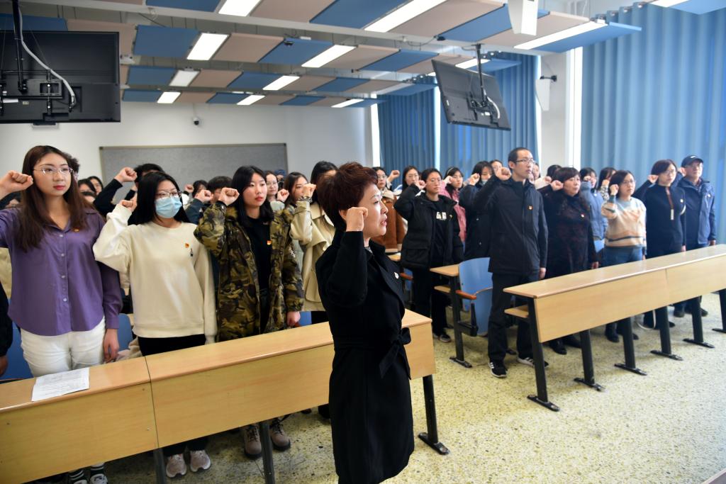 宣誓仪式上,全场师生同唱国际歌,庄严宣读入党誓词,新党员代表作表态发言。