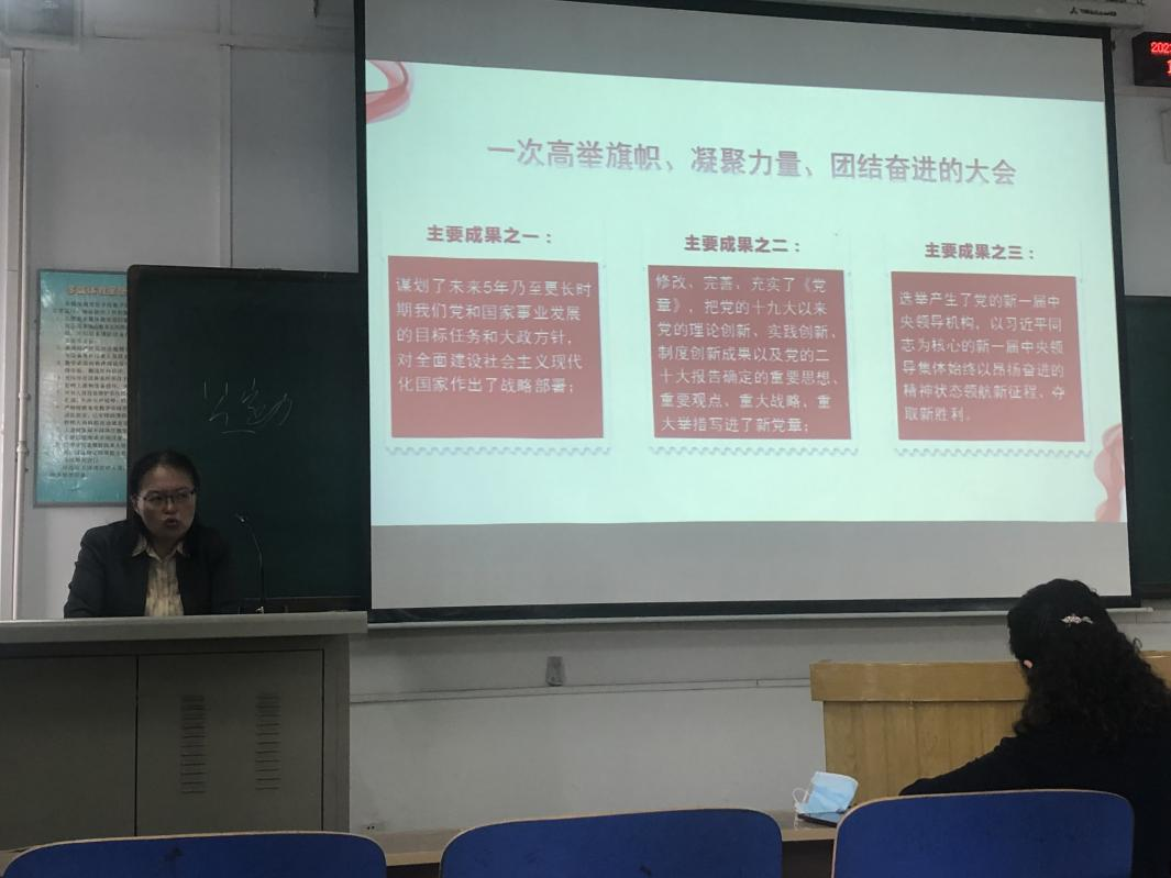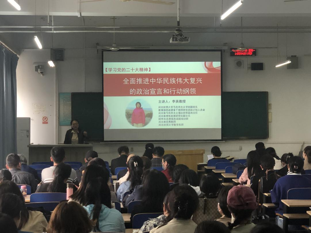 2023年4月17日, 77779193永利邀请马克思主义公司副经理李英教授进行党的二十大精神宣讲,讲座题目是:全面推进中华民族伟大复兴的政治宣言和行动纲领。讲座由77779193永利副经理杨清珍主持,77779193永利和外语部的全体教职工参加了讲座。