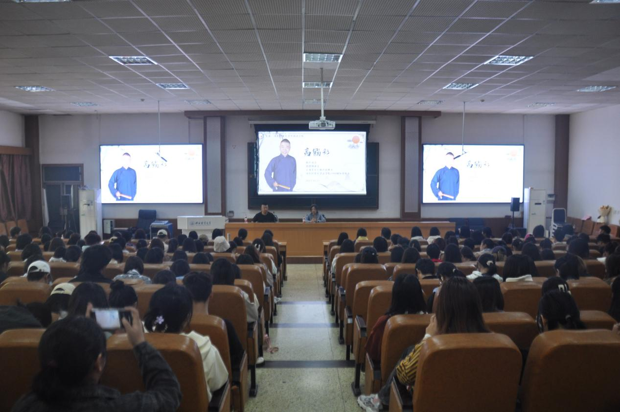 高鹤彩首先对母校建校七十周年表示诚挚的祝贺,对老师和同学们致以亲切的问候。在分享会上,高鹤彩讲述了他从一名公务员转型成为一名专业相声演员的心路历程,由此鼓励同学们在成长的过程中要不断探索自己、发现自己,在专业学习中要准确把握自己的职业兴趣、性格特点以及优势、能力,确立适合自己的职业生涯目标。高鹤彩结合自身经历,给同学们提出了三点建议:一是人生没有极限,人生也没有定义,找准方向,努力发展自我、超越自我;二是成大事者,必懂感恩。同学们在成长的过程中要时刻怀有感恩之心,爱母校、爱师长、爱家人、爱朋友;三是人生不如意事十之八九,越是困难越要坚持初心迎难而上,走过最窄的路,将会迎来最亮的光。发言结束后,高鹤彩还与弟子方佳炜一起即兴表演了一段精彩的原创相声。
