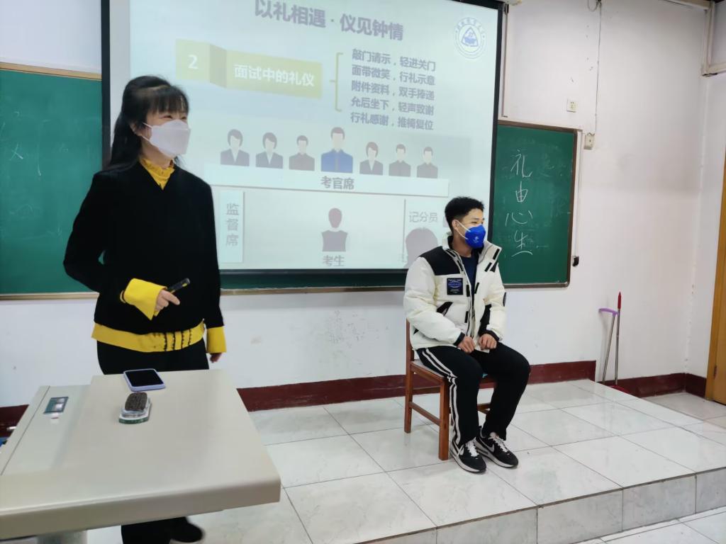 面试时需要注意哪些礼仪?仇静莉从“敲门-进门-站立-行走-微笑-环视-问好-鞠躬-捧递-就座-起立-复位-致谢-出门”14个环节进行了详细讲解,告诉同学们“仪态礼仪是无声的语言,要文明、优雅、敬人,举止有度,要站出自信、走出气场、坐出优雅”。