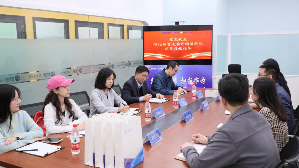 新航道石家庄公司董事长助理兼市场总监耿帅热情接待,带领公司师生参观公司,详细介绍了新航道石家庄公司目前的运营情况、单位规模以及人才需求。