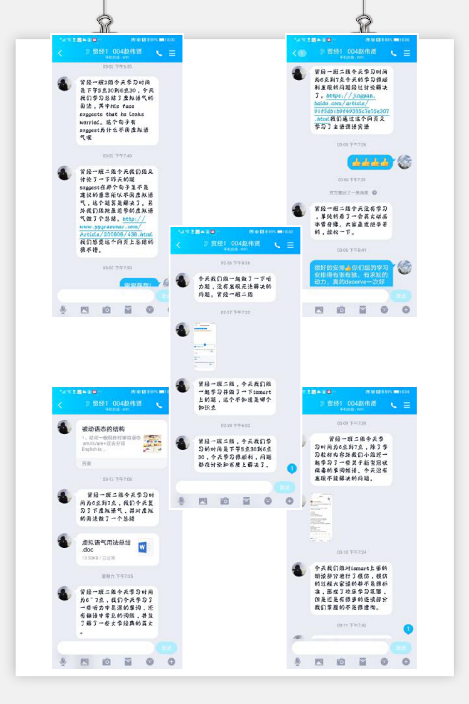 最受员工们欢迎的便是每天小组学习一小时。侯老师希望通过这种方式,加强同学间的交流和沟通,不仅可以解决英语学习上难题,也能缓解由于疫情可能产生的心理健康问题。除了按照课程表上直播课,她所教授的三个英语教学班的小组学习也有声有色地开展起来。其中经管公司19级贸经1班二组的同学表现尤为出色。组长赵伟贤,在组员陈禹菲、齐文雅、薛建坤的配合下,在英语小组学习中获得了极大的乐趣。