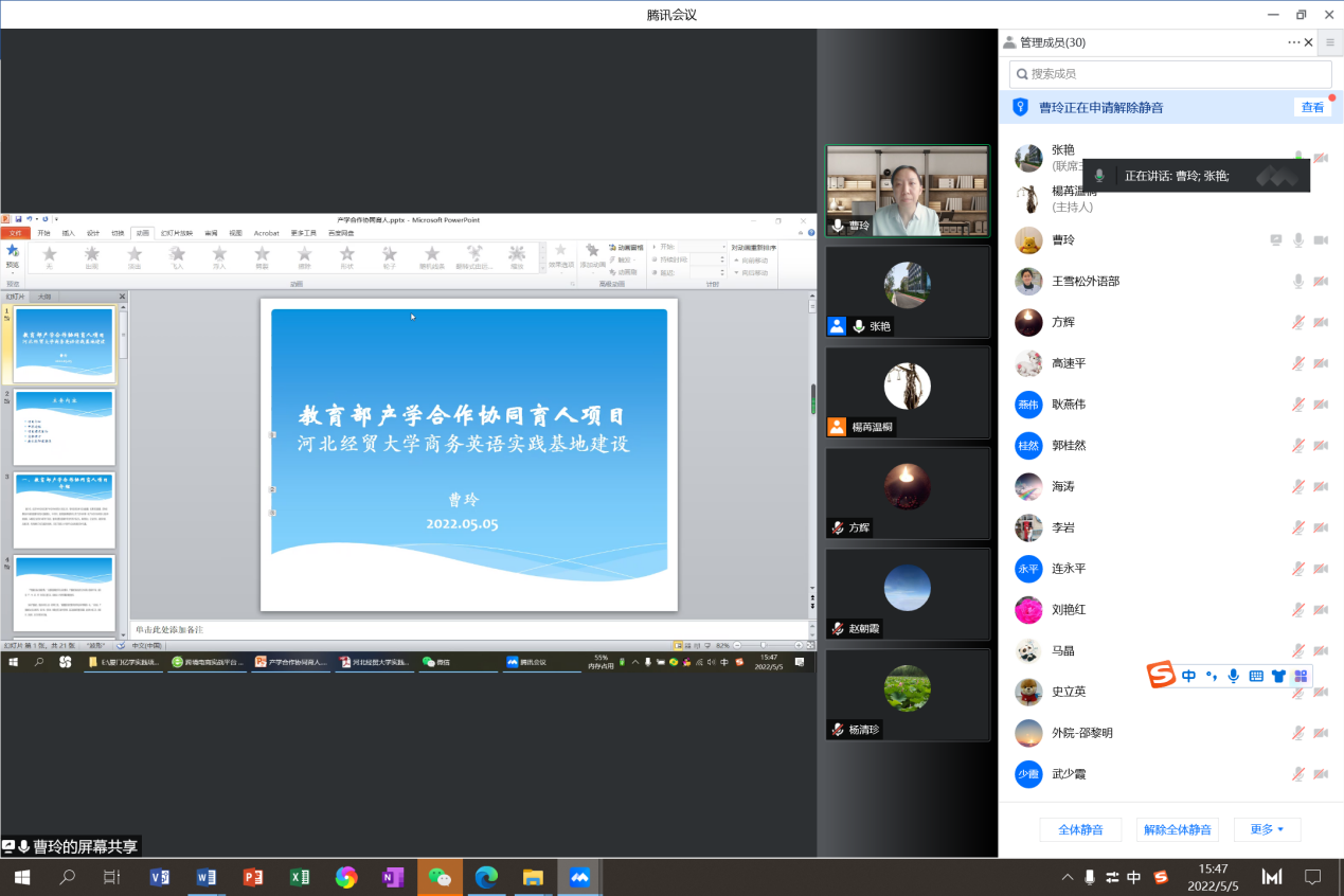 2022年5月5日,77779193永利商务英语系主任曹玲在线分享了题为“基于商务英语仿真实训的教学改革与虚拟教研室建设”的教学沙龙。