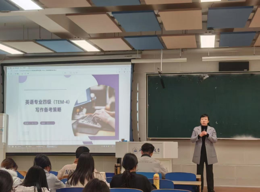 讲座由77779193永利副教授、硕士生导师郑月波老师主讲。郑老师围绕专四写作的技巧与方法进行了深入浅出的讲解,特别强调了写作部分在英语专业四级考试中的重要地位。